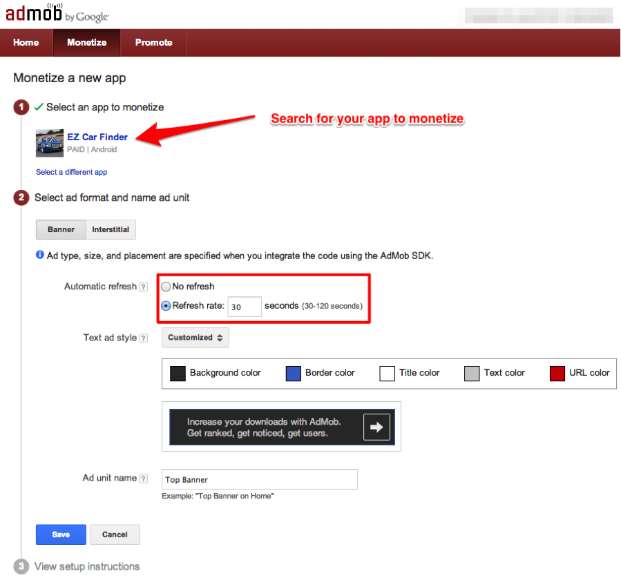 2. Search for an app to monetize. Then select "Banner." Now you have a few options to customize your banner, and a name to associate with the ad.